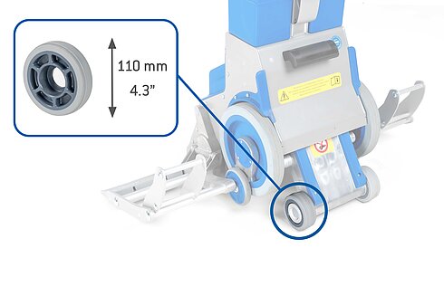 With 200 mm diameter wheels and a track width of just 297 mm the LiftKar PT FOLD is ideal for very steep and narrow spiral staircases. You will quickly become familiarised with the intuitive controls on the LiftKar PT FOLD stairclimber. The most important thing is to get a feel for balance while operating the stairclimber. The integrated level switch is a great help in this respect. New personnel will quickly learn to handle this system with confidence.