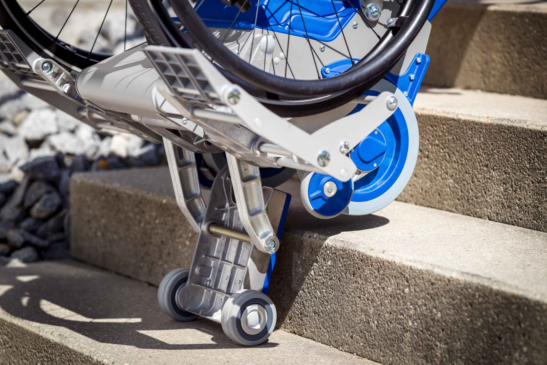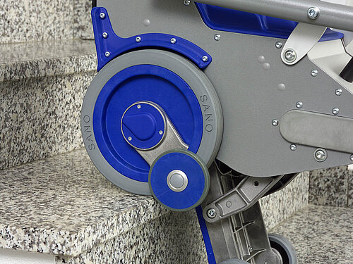 Thanks to its sturdy design with extra-large non-marking wheels, the LiftKar PT OUTDOOR is easy to manoeuvre smoothly and safely over steps, slopes and bumpy ground outside the home. This model is available for people up to 120 kg or 150 kg. The powerful braking system inside the wheel is activated when the stairclimber is tilted back slightly. This effectively prevents it rolling away on slopes or ramps. Switching between single-step and continuous mode can easily be done while on the move.