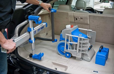 The washable seat cover can be wiped clean and removed by simply undoing a zip. While you are not using the LiftKar PT FOLD it can be simply folded away! Saves space at work and on the road. The LiftKar PT FOLD is lightweight and can easily be stowed away in any vehicle. And with the in-transit charger you can recharge the battery unit on the move - so that the LiftKar PT FOLD is ready for action whenever you are.